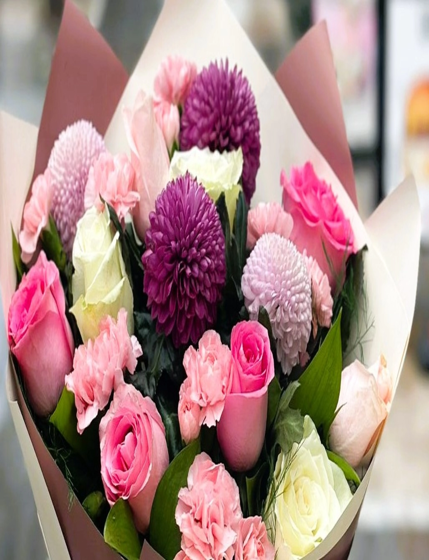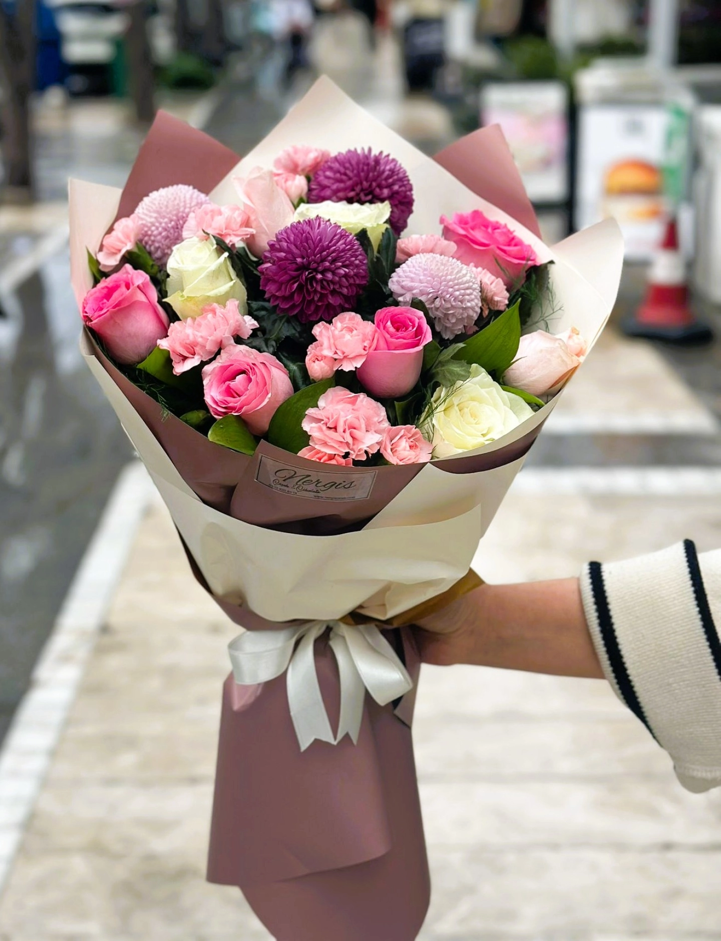 anastasya ve renkli güllerden oluşan buket