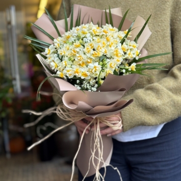Nergis buketi naturel Tasarım 'da kullanılan çiçek ve aksesuarlar stok durumuna göre farklılık gösterilebilir.