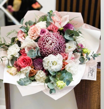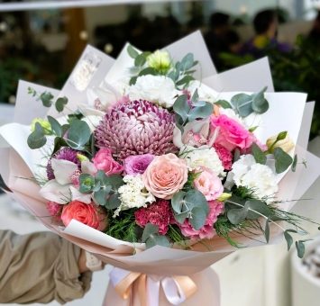 pembe gül,beyaz lisyantus ve anastasyalardan oluşan şık buket