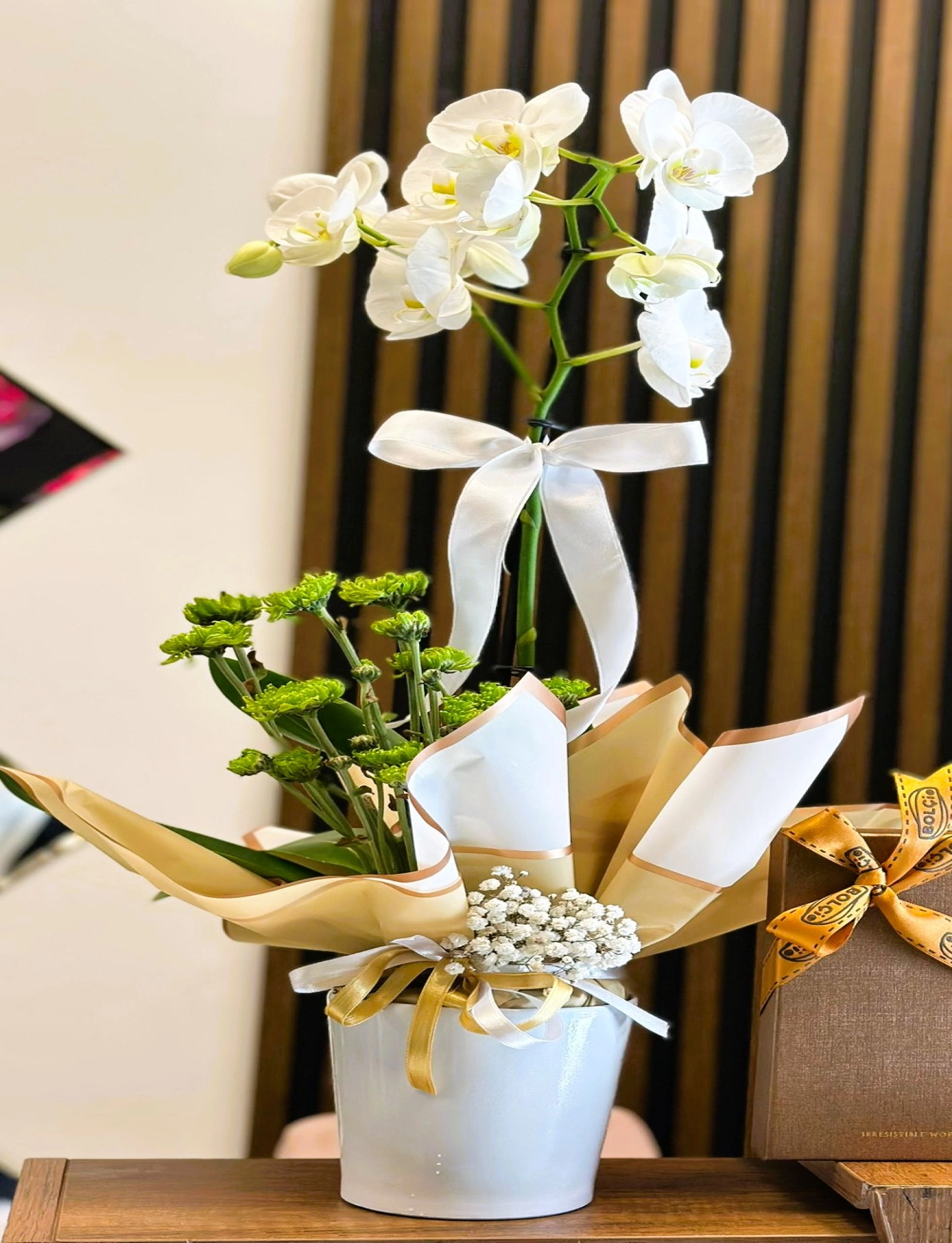 seramik vazo içerisinde beyaz tek dallı orkide